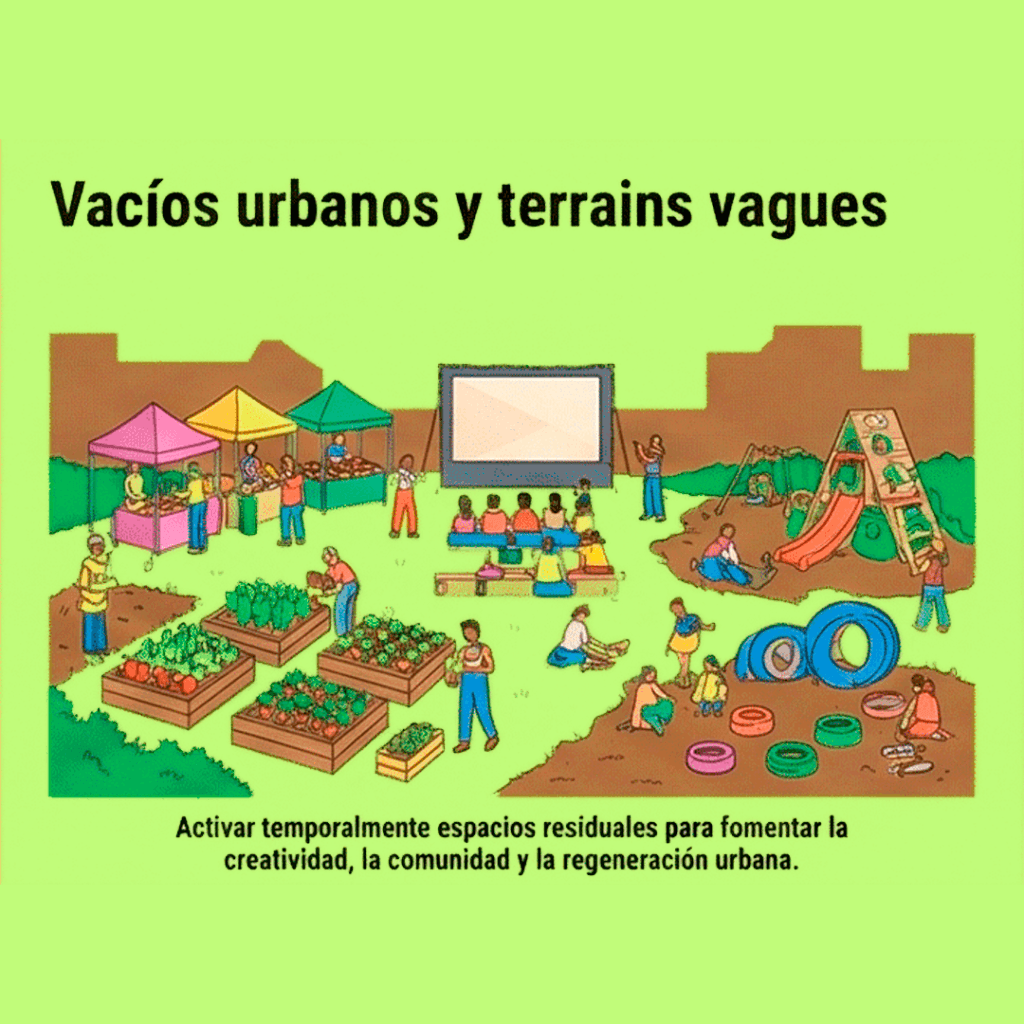 Los terrenos baldíos, los espacios residuales bajo infraestructuras o las parcelas abandonadas no son «la nada»; son espacios de oportunidad latente. El diseñador urbano opera aquí a menudo mediante el urbanismo táctico y estrategias temporales. Estos vacíos son laboratorios ideales para huertos urbanos, espacios culturales efímeros o nuevos corredores ecológicos, permitiendo testear usos antes de inversiones definitivas.